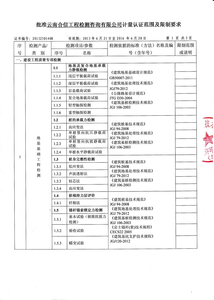 云南合信工程檢測(cè)咨詢有限公司地基基礎(chǔ)工程檢測(cè)主要能力為