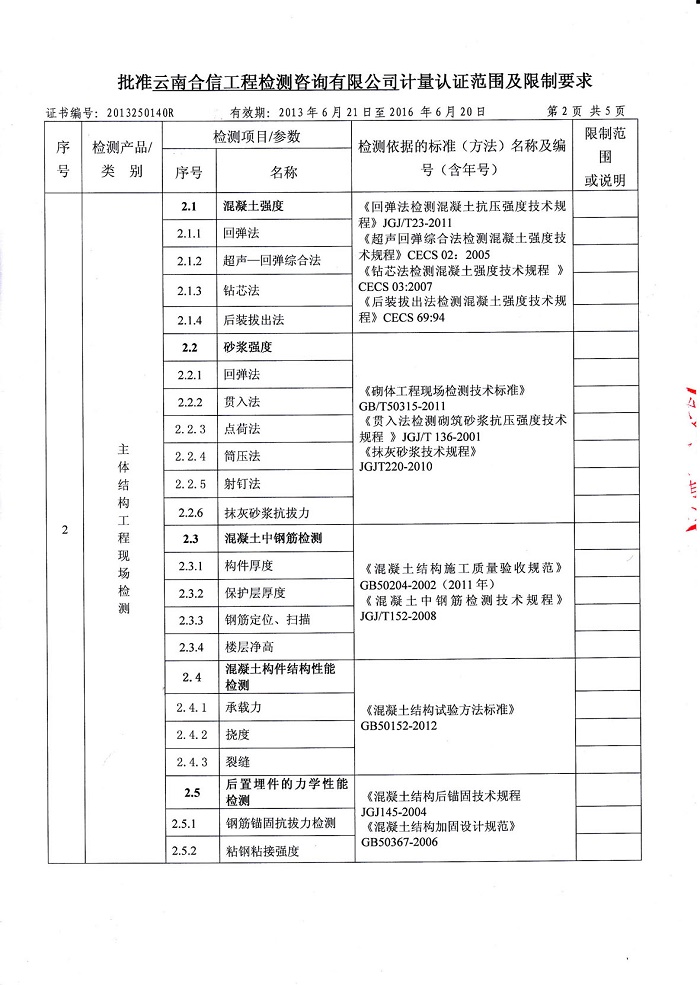 云南合信工程檢測(cè)咨詢有限公司主體結(jié)構(gòu)工程檢測(cè)主要能力為: