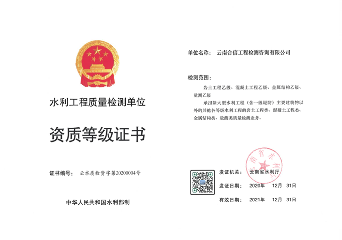 “水利工程質(zhì)量檢測單位乙級資質(zhì)”的取得,是云南省水利廳對云南合信公司檢測能力的充分肯定,標(biāo)志著公司的服務(wù)能力進一步增強,綜合競爭力進一步提高,為公司跨領(lǐng)域、跨區(qū)域發(fā)展打下了良好的基礎(chǔ)。