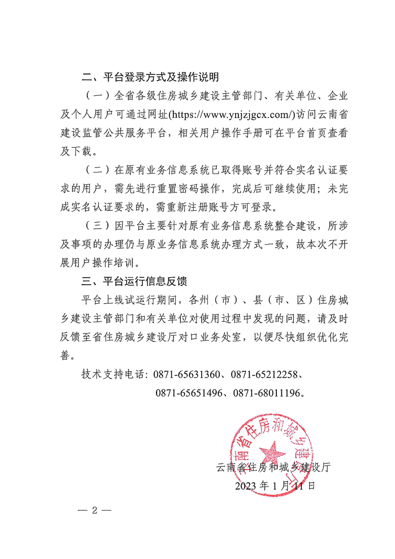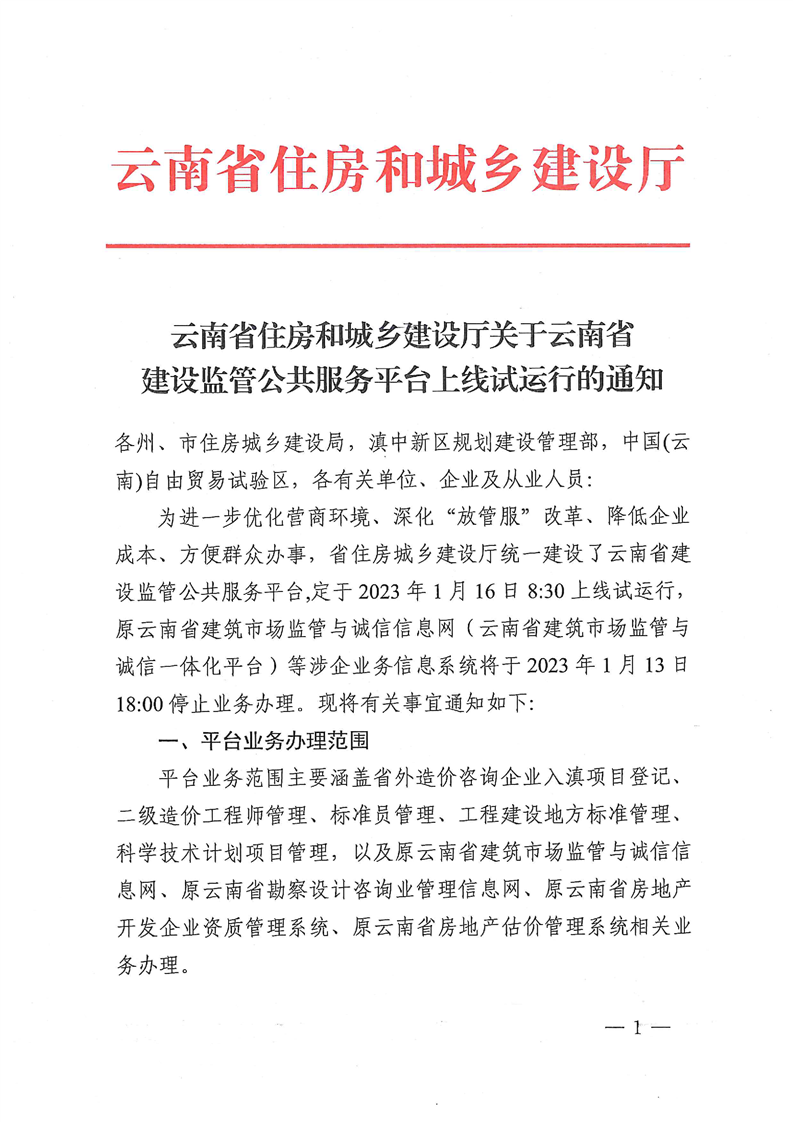 云南省住房和城鄉(xiāng)建設(shè)廳關(guān)于云南省建設(shè)監(jiān)管公共服務(wù)平臺上線試運(yùn)行的通知