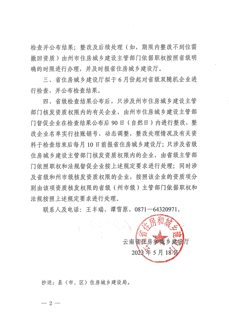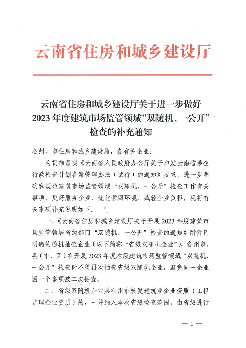 云南省住房和城鄉(xiāng)建設(shè)廳關(guān)于進(jìn)一步做好2023年度建筑市場監(jiān)管領(lǐng)域“雙隨機(jī)、一公開”檢查的補(bǔ)充通知