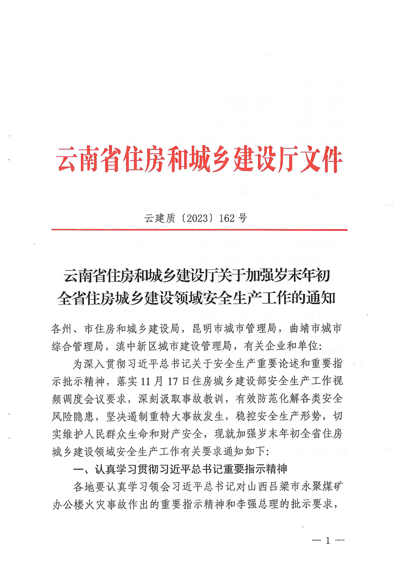 云南省住房和城鄉(xiāng)建設(shè)廳關(guān)于加強(qiáng)歲末年初全省住房城鄉(xiāng)建設(shè)領(lǐng)域安全生產(chǎn)工作的通知