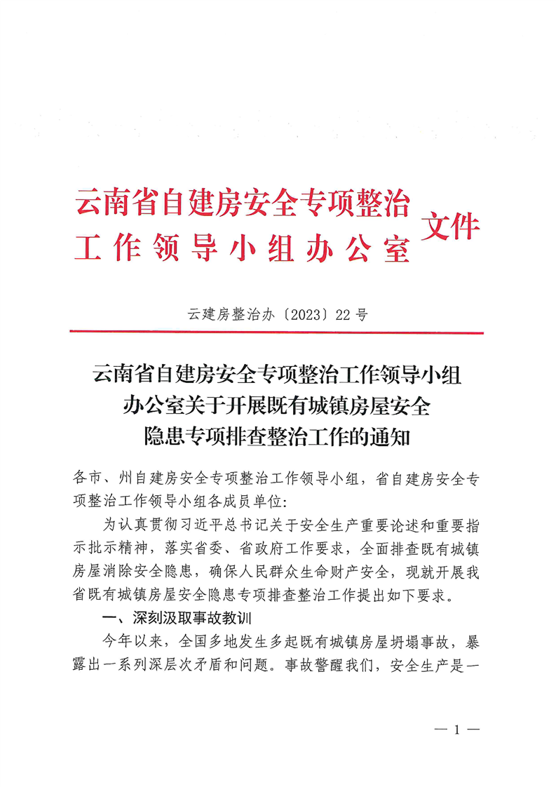 云南省自建房安全專項(xiàng)整治工作領(lǐng)導(dǎo)小組辦公室關(guān)于開展既有城鎮(zhèn)房屋安全隱患專項(xiàng)排查整治工作的通知